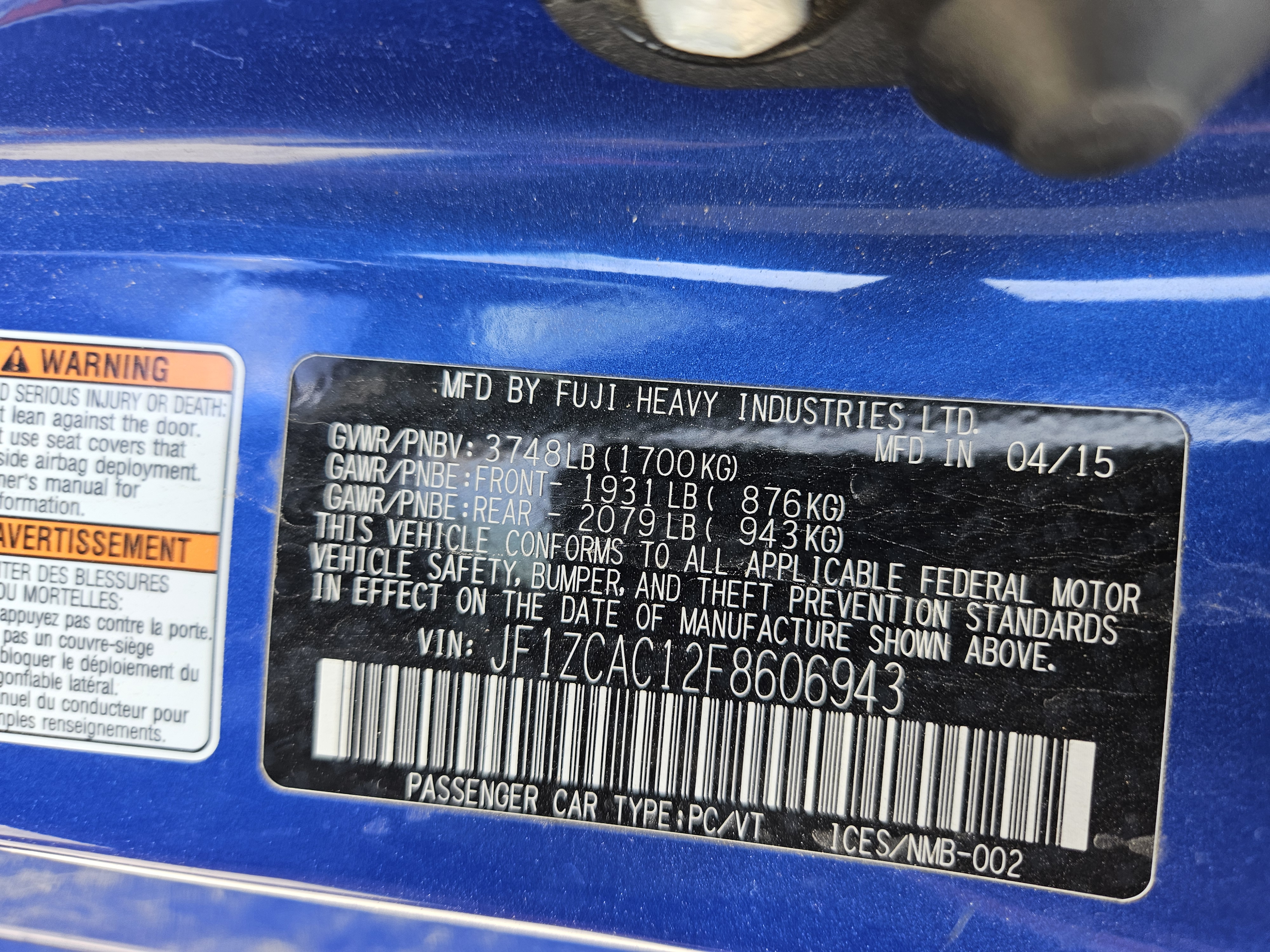 2015 SUBARU BRZ 2.0L AT COUPE, PARTS ONLY