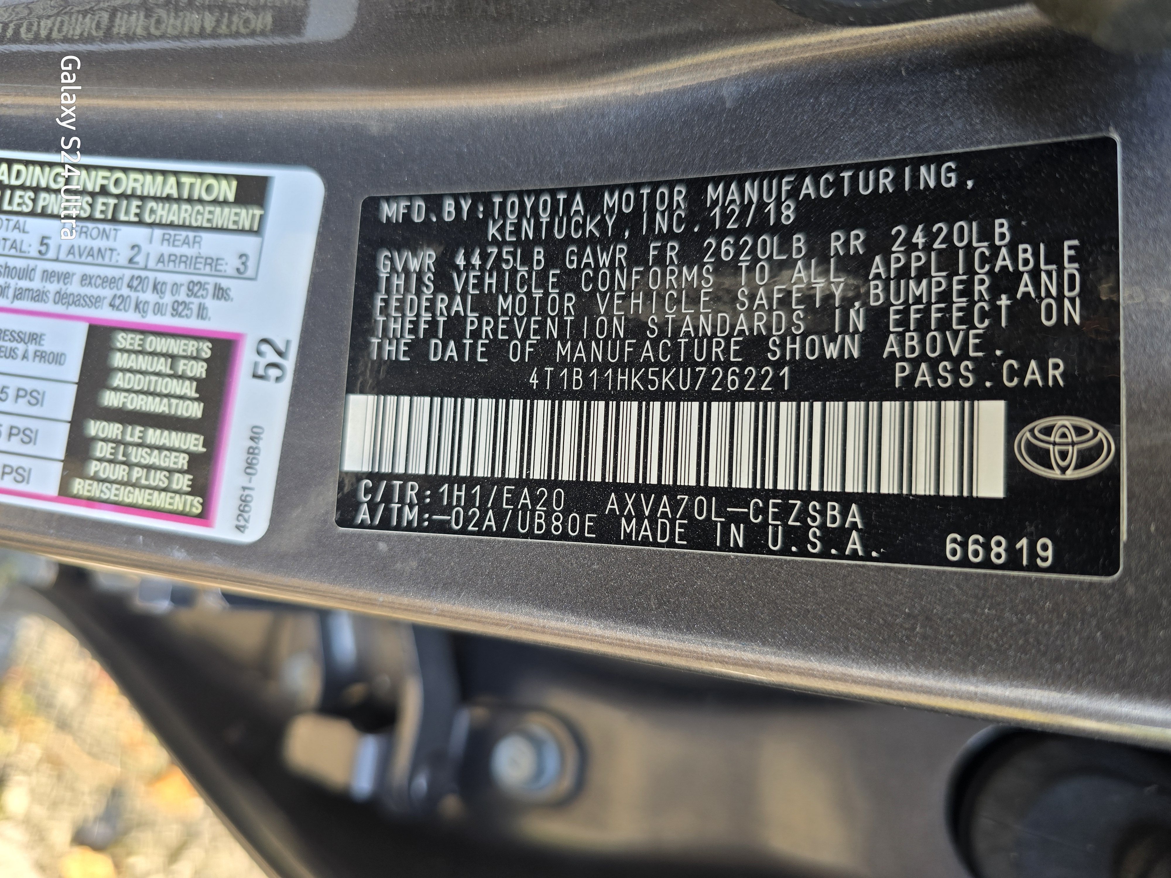 2019 TOYOTA CAMRY SE 2.5L AT, PARTS ONLY